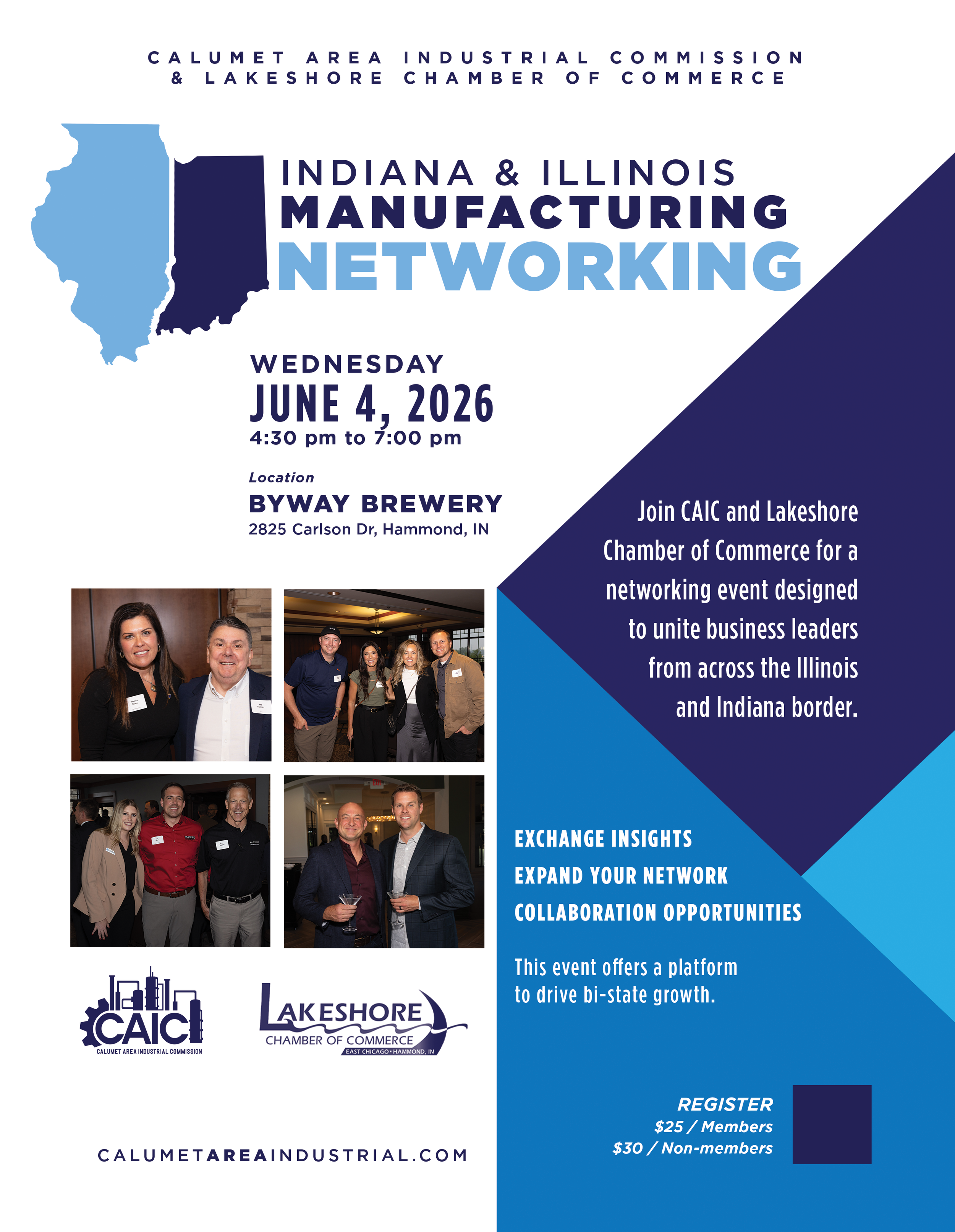 Back to All Events Indiana & Illinois Manufacturing Networking Thursday, June 4, 2026 4:30 PM 7:00 PM Byway Brewery 2825 Carlson Drive Hammond, IN, 46323 United States (map) Google Calendar ICS